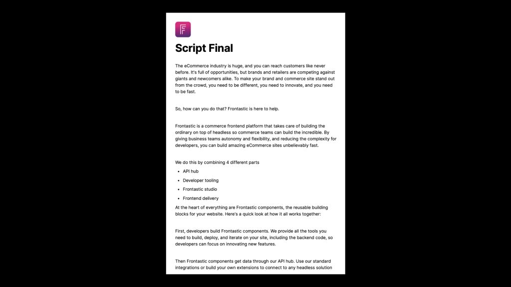 The first stage was establishing a brief where all context for the video was provided. Frontastic had a script, voice-over, and visual ideas that best represented their concept and branding, but wanted Galera to take it to the next level and better incorporate their branding and visual ideas.